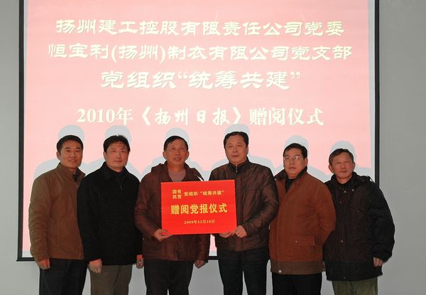 系統黨委向統籌共建單位贈閱黨刊 時間:2009-12-225360 12月18日,建控公司黨委積極與外資企業恒寶利(揚州)公司黨支部開展國有民營黨組織“統籌共建”活動,向其贈閱了2010年《揚州日報》以及《黨章》等黨報黨刊學習資料,并與團員青年、入黨積極分子開展座談互動交流。