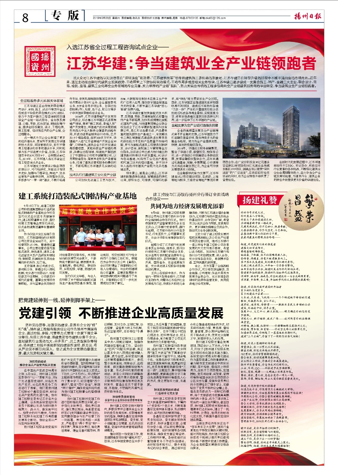 為了充分展示新中國成立70年來特別是黨的十八大以來建工控股改革發(fā)展所取得的歷史性成就,公司推出一期《揚州日報》國慶專版,并對公司網(wǎng)站進(jìn)行了全面改版,更加符合當(dāng)下信息宣傳需要。系統(tǒng)企業(yè)江蘇華建、揚建集團參加由市政府舉辦的2019運河文化嘉年華活動,用精心裝飾的花船點亮了千年運河的獨特風(fēng)姿。江蘇華建同時聯(lián)合揚州廣電推出了慶祝新中國成立70周年特別策劃——《愿以此身長報國》,展現(xiàn)了一個地方國企的初心和擔(dān)當(dāng)。